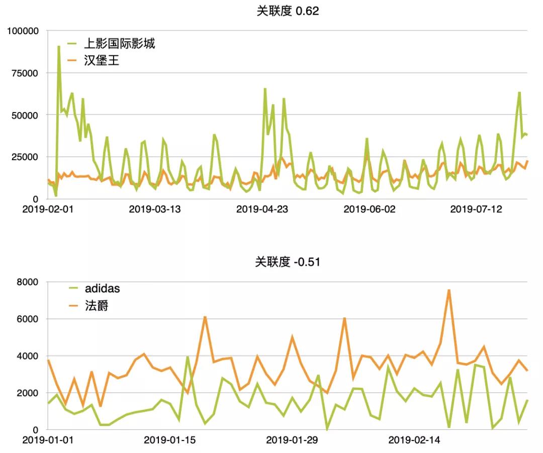 相關(guān)性分析可以在眾多數(shù)據(jù)中找到兩個(gè)不同品牌、樓層的統(tǒng)一性,從而確定兩者是否存在強(qiáng)相關(guān)。舉例來(lái)說(shuō),可以分析兩個(gè)位置不相關(guān)、品類不相關(guān)的品牌,在銷售周期區(qū)間是否有同樣的銷售波動(dòng)曲線。