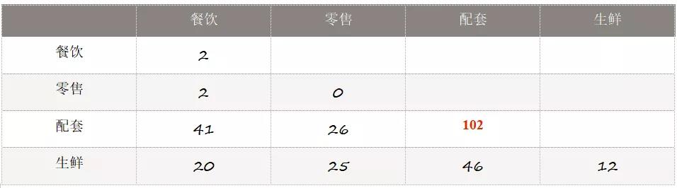 從上圖可以看出,餐飲則與其他業(yè)態(tài)關(guān)聯(lián)性不強(qiáng),這可以判斷餐飲客人的消費(fèi)習(xí)慣并不和其他品牌相關(guān);另一方面,配套業(yè)態(tài)品牌內(nèi)循環(huán)非常強(qiáng)烈,說(shuō)明該品類客群內(nèi)部消化情況很重,同時(shí)對(duì)于其他品類也有貢獻(xiàn);最后零售業(yè)內(nèi)部關(guān)聯(lián)數(shù)量為0,則說(shuō)明這個(gè)品類的客群有可能是非常不同的。綜上均需要進(jìn)一步分析,以便于得到更完整的結(jié)論。