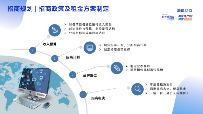 在招商調(diào)整階段,還可利用大數(shù)據(jù)對(duì)招商調(diào)整進(jìn)行支撐,解決招調(diào)階段普遍存在的招商數(shù)據(jù)不足、規(guī)則不清晰的問題。在招商規(guī)劃階段,提供招商政策及租金方案制定,招商策略、租金計(jì)劃、收入預(yù)算支持。