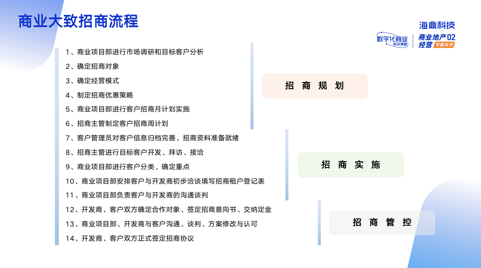 通常而言,商業(yè)項(xiàng)目的招商流程分為三個(gè)階段,包括:招商規(guī)劃、招商實(shí)施、招商管控。如何通過數(shù)字化能力助力招商,讓招商流程如虎添翼?