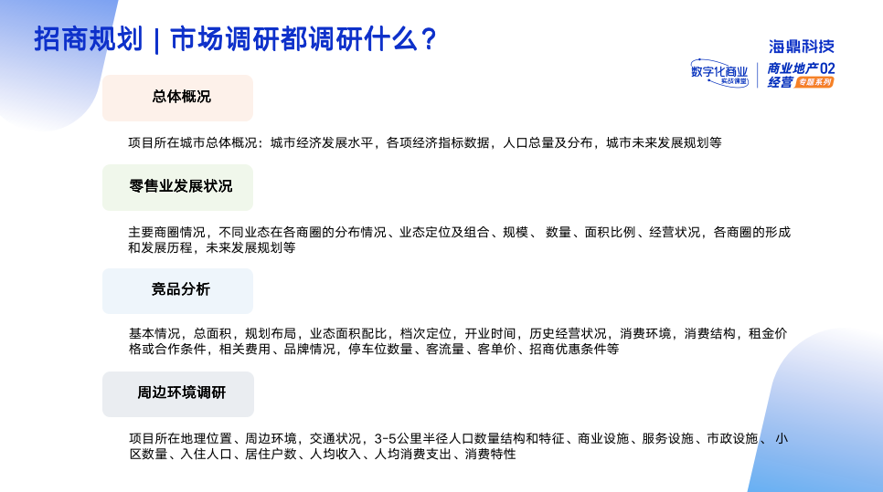招商規(guī)劃的第一件事情是市場(chǎng)調(diào)研,主要調(diào)研內(nèi)容包括:總體概況、零售業(yè)發(fā)展?fàn)顩r、競(jìng)品分析、周邊環(huán)境調(diào)研等內(nèi)容,以此作為項(xiàng)目定位、商業(yè)業(yè)態(tài)規(guī)劃、租金標(biāo)準(zhǔn)測(cè)算、物管費(fèi)測(cè)算、招商宣傳推廣費(fèi)預(yù)算、組織架構(gòu)編制等依據(jù)。