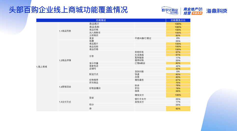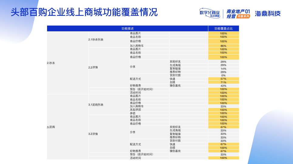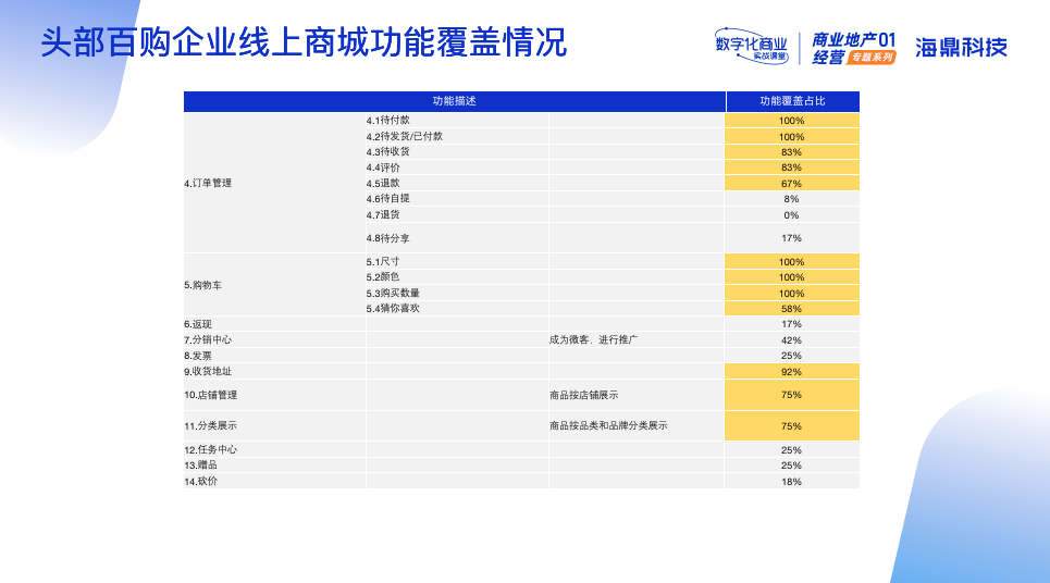 為了更好地幫助企業(yè)部署線上商城功能,提供參考方向。此次線上課堂特意收集了當(dāng)前百購(gòu)頭部企業(yè)的線上商城功能覆蓋情況。依據(jù)收集情況來(lái)看,頭部企業(yè)線上商城功能主要涵蓋商品展示、秒殺、團(tuán)購(gòu)、訂單管理、購(gòu)物車、返現(xiàn)、分銷中心、發(fā)票等14大功能版塊。