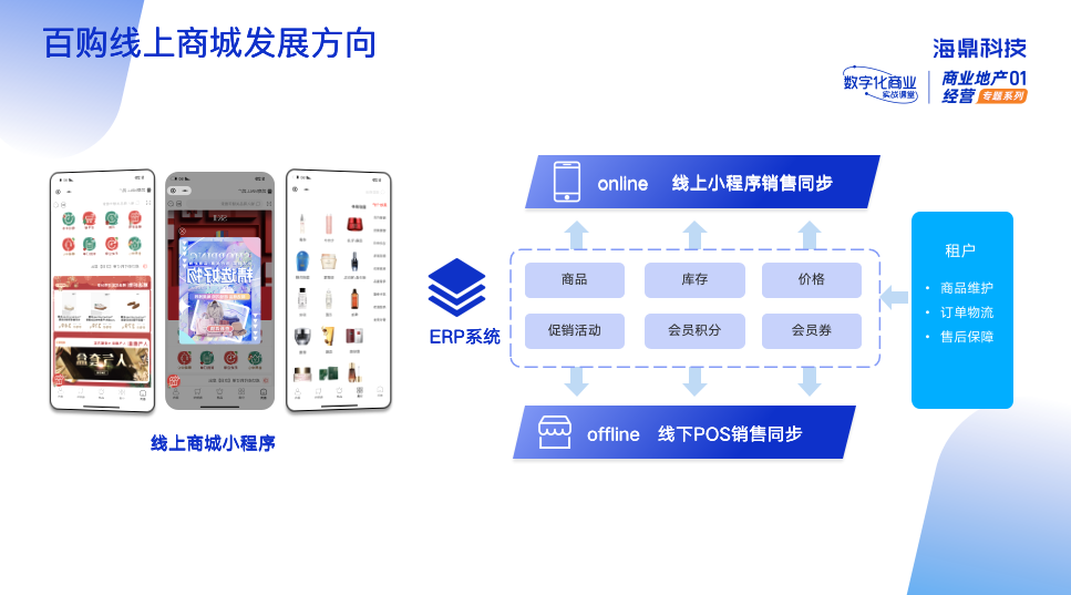 綜上所述百購(gòu)的業(yè)務(wù)特點(diǎn),百購(gòu)線上商城發(fā)展方向一方面需要結(jié)合ERP系統(tǒng)打造線上線下一體化管理模式,將線下購(gòu)物體驗(yàn)云化運(yùn)營(yíng),包括:商品庫(kù)存同步、價(jià)格一致、會(huì)員權(quán)益、營(yíng)銷活動(dòng)統(tǒng)一;另一方面,需要將租戶資源融合到線上運(yùn)營(yíng),租戶自己就可以管理商品、訂單和物流,減輕運(yùn)營(yíng)成本,提升經(jīng)營(yíng)效率。