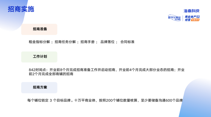 當(dāng)項(xiàng)目進(jìn)入招商實(shí)施階段后,執(zhí)行的任務(wù)非常繁瑣,其中包括招商準(zhǔn)備、工作計(jì)劃擬定執(zhí)行和招商方案的落地實(shí)施。