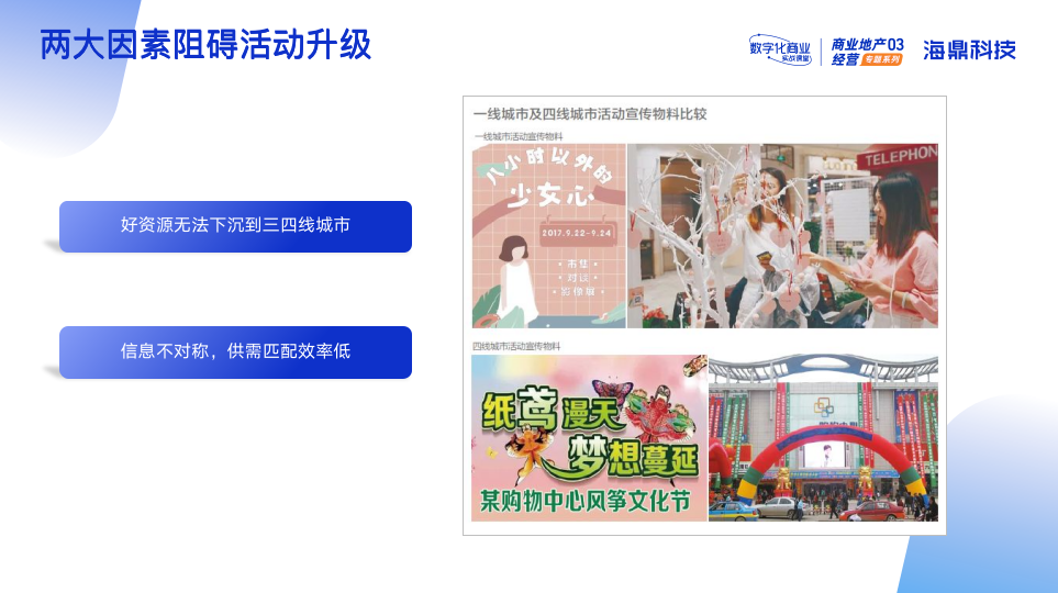 多項(xiàng)數(shù)據(jù)顯示,同一個(gè)活動(dòng)在不同的商場(chǎng),所呈現(xiàn)的效果具有明顯差異。在這些數(shù)據(jù)中也發(fā)現(xiàn)了兩大因素在阻礙活動(dòng)的升級(jí)。首先,好的資源無法下沉到三四線城市,即新型活動(dòng)資源和活動(dòng)創(chuàng)意的下沉邊界卡在二線城市上。而且,商場(chǎng)活動(dòng)供應(yīng)商的資源透明度低,三四線城市的小型開發(fā)商合同結(jié)款方面操作不規(guī)范,外來供應(yīng)商很難以與其建立互信關(guān)系,導(dǎo)致活動(dòng)資源下沉動(dòng)力不足。