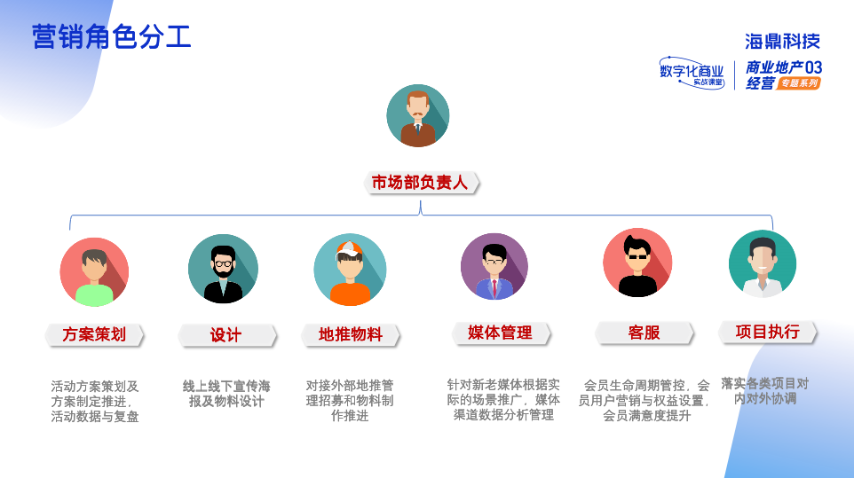 首先,我們要回歸到營(yíng)銷本身,每個(gè)商場(chǎng)的營(yíng)銷活動(dòng)主要由商場(chǎng)市場(chǎng)部(企劃部)牽頭,對(duì)項(xiàng)目各項(xiàng)活動(dòng)的對(duì)外形象進(jìn)行全面把控,并主要由以下六種角色共同配合,開展?fàn)I銷運(yùn)營(yíng)。