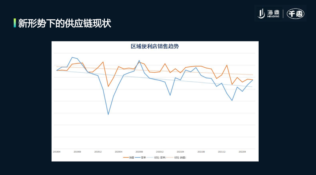 第二張圖是某個(gè)區(qū)域便利店的銷售數(shù)據(jù),可以看到從2020年至今,銷售額谷底出現(xiàn)在2020年疫情剛爆發(fā)的時(shí)候,而且銷售趨勢(shì)線和客流趨勢(shì)線相隔越來越遠(yuǎn),這意味雖然單價(jià)好像提高了,但是客流卻減少了,整體呈現(xiàn)下行趨勢(shì)。