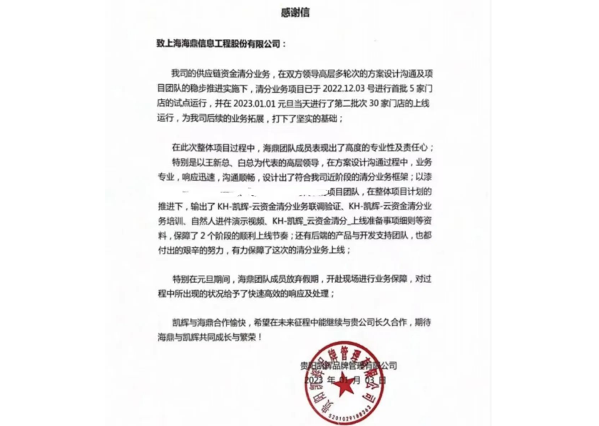 更為重要的是,此方案是可以復(fù)用的資金切換方案,后續(xù)其他客戶有相應(yīng)需求時(shí),海鼎也能快速響應(yīng),幫助客戶實(shí)現(xiàn)對(duì)加盟業(yè)務(wù)資金的智慧化管理。海鼎團(tuán)隊(duì)高度的專業(yè)性及責(zé)任心獲得了凱輝的一致認(rèn)可,為此,凱輝特意發(fā)來(lái)感謝信。