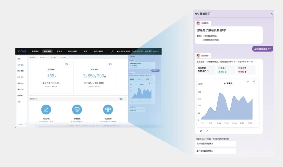 借助AI技術(shù),海鼎科技旗下商管、數(shù)字化營(yíng)銷平臺(tái)等產(chǎn)品已初步具備智能分析能力。AI助手能夠基于系統(tǒng)內(nèi)部數(shù)據(jù)進(jìn)行分析,揭示數(shù)據(jù)背后的規(guī)律與趨勢(shì),實(shí)現(xiàn)從“發(fā)生了什么”到“為什么會(huì)發(fā)生”再到“未來(lái)如何行動(dòng)”的升級(jí)轉(zhuǎn)變。這一轉(zhuǎn)變,不僅提升了系統(tǒng)的應(yīng)用價(jià)值,還為企業(yè)提升了管理準(zhǔn)確性、決策效率,從而幫助商業(yè)體建立行業(yè)競(jìng)爭(zhēng)優(yōu)勢(shì)。