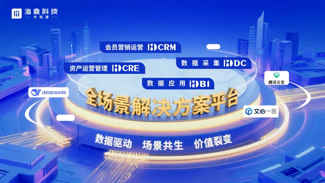 海鼎科技自主研發(fā)的數(shù)智化全場(chǎng)景解決方案平臺(tái),在整合DeepSeek、騰訊元寶、文心一言等主流AI大模型的同時(shí),結(jié)合海鼎科技智慧商業(yè)知識(shí)體系匹配調(diào)整,精準(zhǔn)度較通用模型提升30%,為資產(chǎn)運(yùn)營(yíng)管理(HDCRE)、會(huì)員營(yíng)銷運(yùn)營(yíng)(HDCRM)、數(shù)據(jù)應(yīng)用(HDBI)、數(shù)據(jù)采集(HDDC)等核心產(chǎn)品方案注入“AI智腦”支撐,推動(dòng)商業(yè)地產(chǎn)從傳統(tǒng)空間租賃管理模式向“數(shù)據(jù)驅(qū)動(dòng)、場(chǎng)景共生、價(jià)值裂變”智慧生態(tài)進(jìn)化。